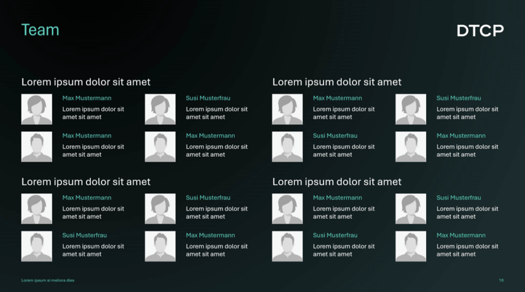 Durch die feste Positionierung von Platzhaltern für Bild und Text-Bausteine, Logos, Grafiken & Co. entstehen mehrere Design-Vorlagen, sogenannte PowerPoint Templates, die bei wiederholter Nutzung für ein einheitliches Gesamtbild Ihrer Präsentationen sorgen.