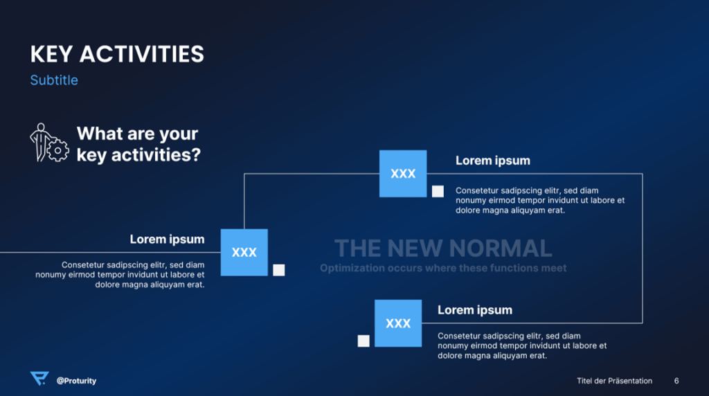 Überarbeitung der Unternehmenspräsentation in einem modernen Look & Feel. Ziel: Visuell ansprechende Informationsdarstellung und Layout-Aufbau des gelieferten Inputs im neu erstellten Folienmaster.