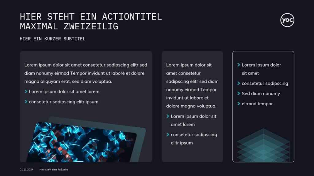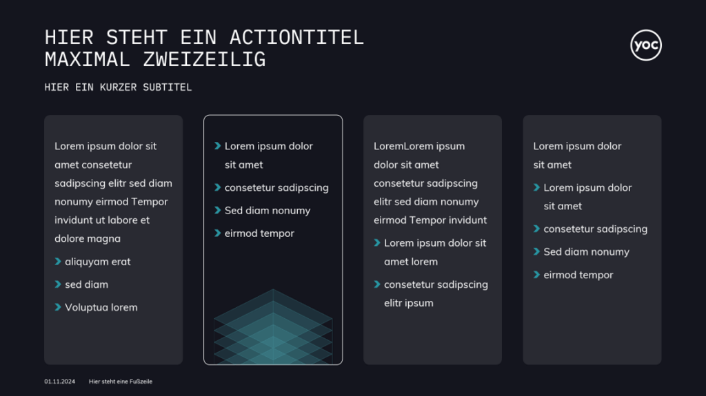 Das können Folien-Layouts sein, die inhaltlich immer wieder in Präsentationen auftauchen, oder Layout-Vorschläge für die Visualisierung von neuen Inhalten bieten.