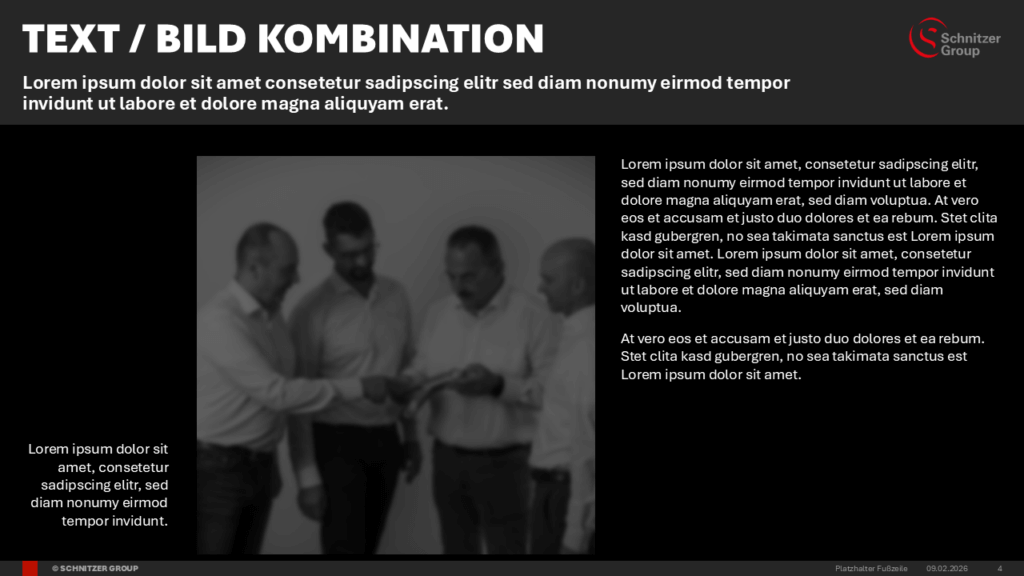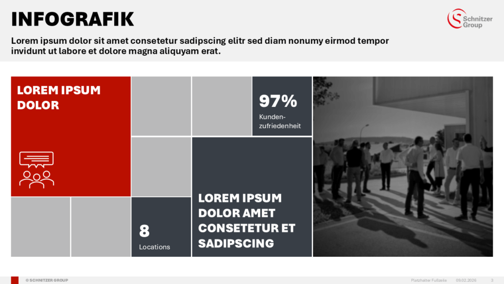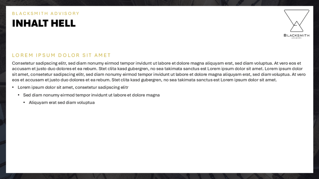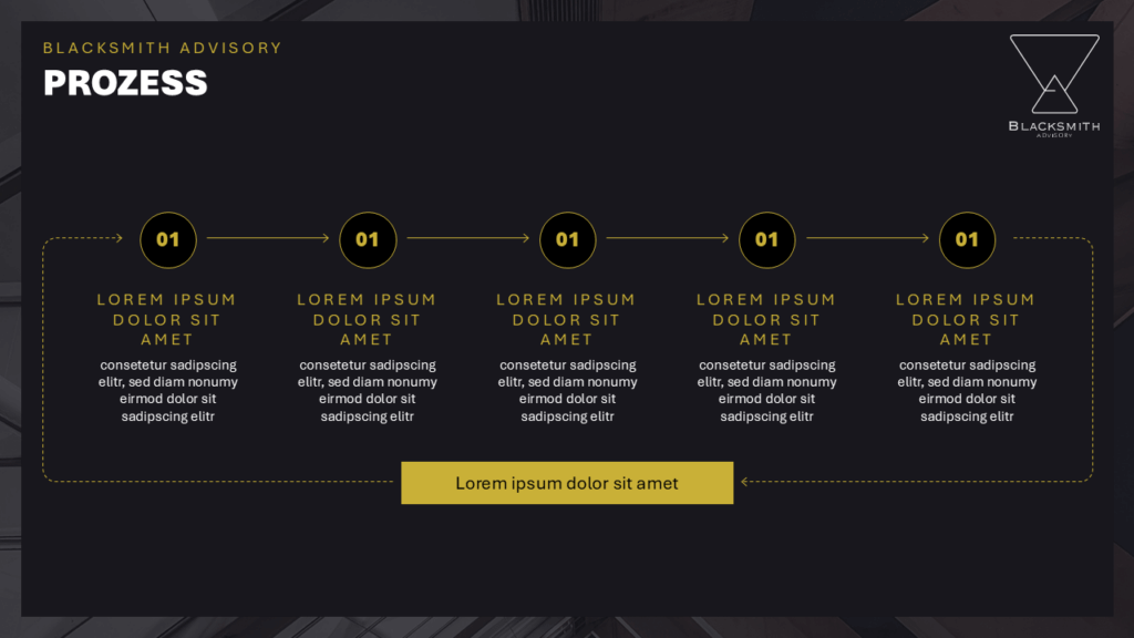 Überarbeitung der Unternehmenspräsentation in einem modernen Look & Feel. Ziel: Visuell ansprechende Informationsdarstellung und Layout-Aufbau des gelieferten Inputs im neu erstellten Folienmaster.