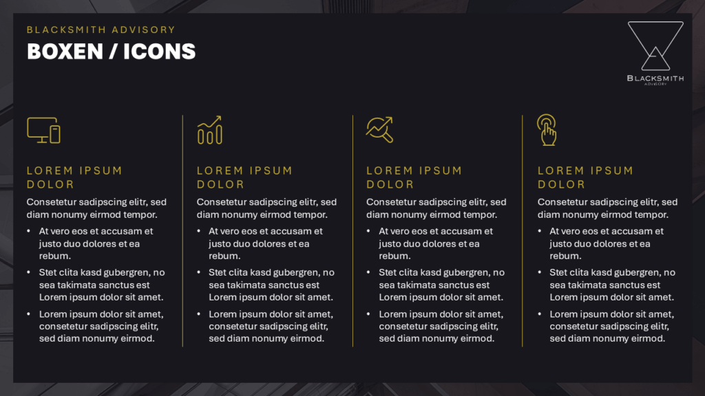 Erstellung einer Pitch Deck Vorlage im Corporate Design des Kunden mit unterschiedlichen Templates für verschiedene Contents inklusive Folienbibliothek.