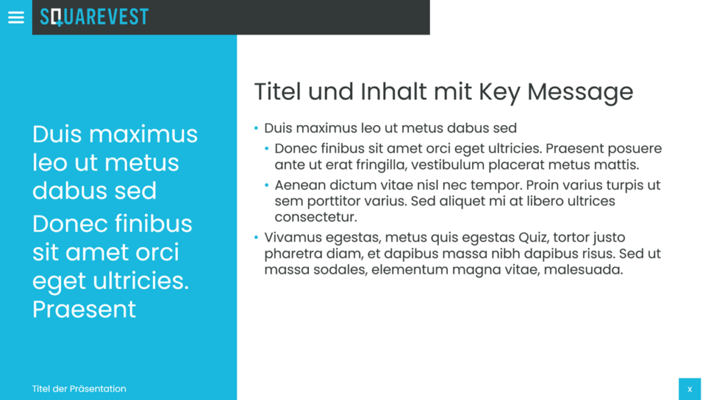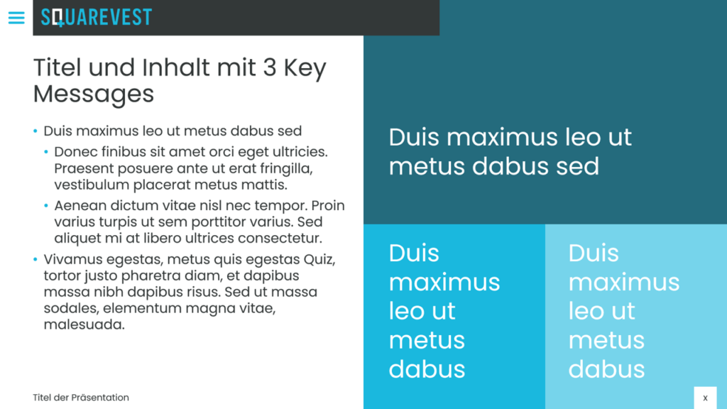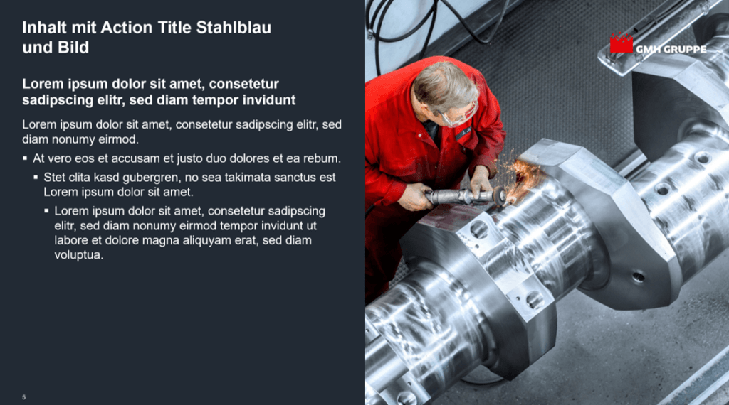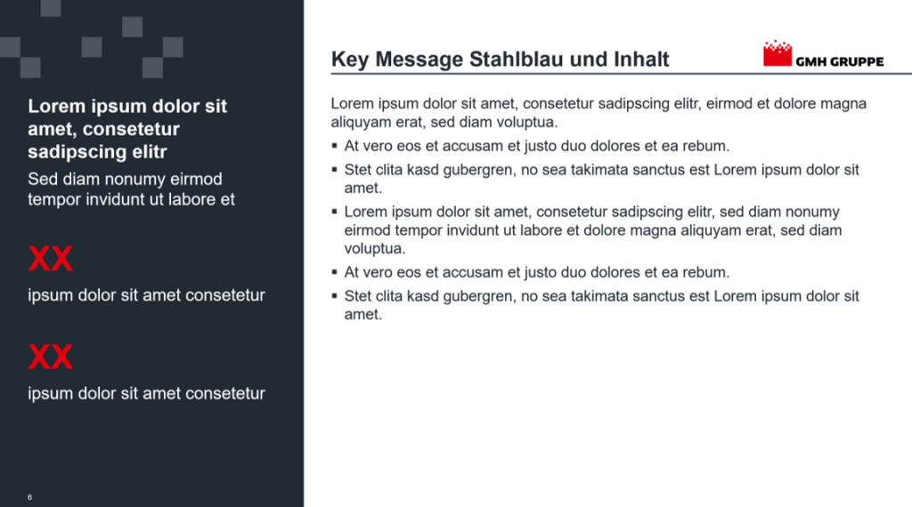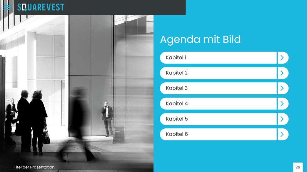 Die Einstellung der Masterfolie umfasst die Positionierung von Bulletpoints, Contentbereich, Führungslinien, Überschriften, Bild- und Inhaltsplatzhaltern sowie Fußzeilen. Darüber hinaus entwickeln wir verschiedene Standardlayouts wie Titelfolien, Kapiteltrenner, Agenda und spezialisierte Contentfolien mit verschiedenen Text- und Bildkombinationen.