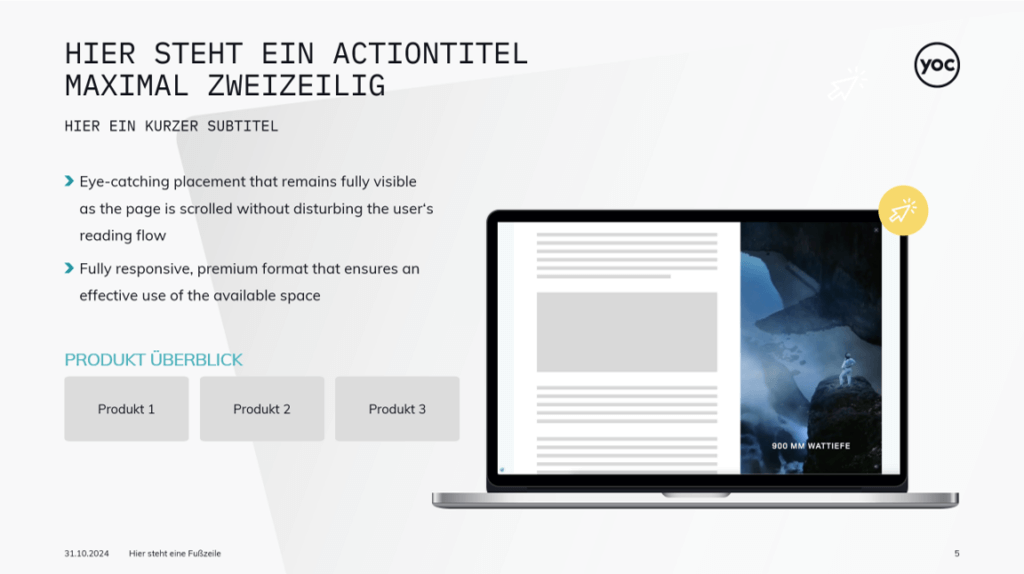 Das Ziel liegt auf der Hand: Möglichst viele Interessierte sollen von dem Nutzen Ihres Produkts überzeugt werden. Wir stellen alle wichtigen Details über Ihr Produkt ansprechend, kompakt und auf den Punkt dar und setzen Ihre Ideen und Visionen wirkungsvoll in Szene.